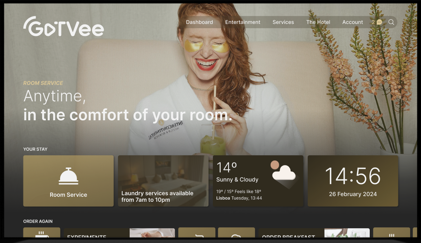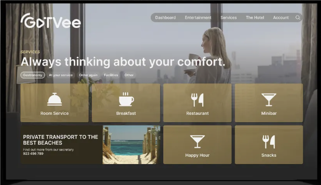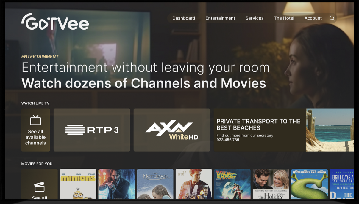 A solução de TV interativa da GoTVee transforma a TV do quarto num canal direto de comunicação e promoção de serviços, melhorando a experiência dos hóspedes e a rentabilidade do hotel. Permite personalizar a interface com a identidade do hotel, integrar canais de TV, streaming e conteúdos sob demanda, e promover serviços internos como room service, spa e atividades locais. Com gestão centralizada via Backoffice, o hotel pode atualizar a grelha de canais, enviar mensagens personalizadas e recolher dados de uso para decisões estratégicas.
