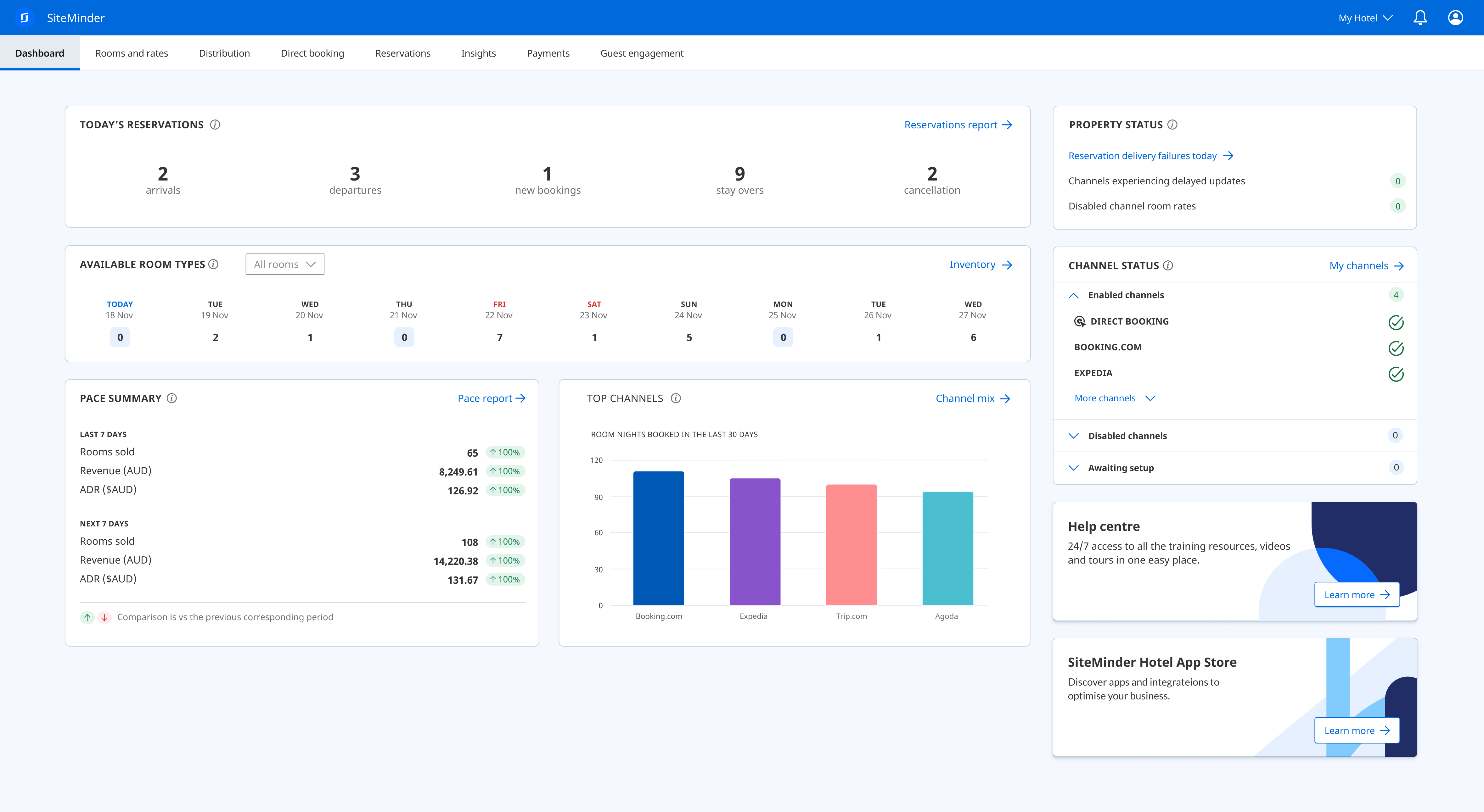 Gerando 120 milhões de reservas no valor de 75 mil milhões de dólares anuais, a plataforma da SiteMinder oferece inteligência de mercado e a solução de distribuição número 1 do setor para otimizar preços, planos tarifários, inventário e canais (com acesso a mais de 490). Com títulos como ‘Melhor Plataforma de eCommerce para Hotéis’, ‘Melhor Gestor de Canais’ e ‘Melhor Motor de Reservas’, a SiteMinder tem tudo o que um hotel precisa para maximizar receitas e adotar uma abordagem dinâmica de preços na nova era da hotelaria. No entanto, não são os títulos ou distinções que nos motivam - são as experiências positivas dos nossos clientes e os resultados tangíveis que entregamos.