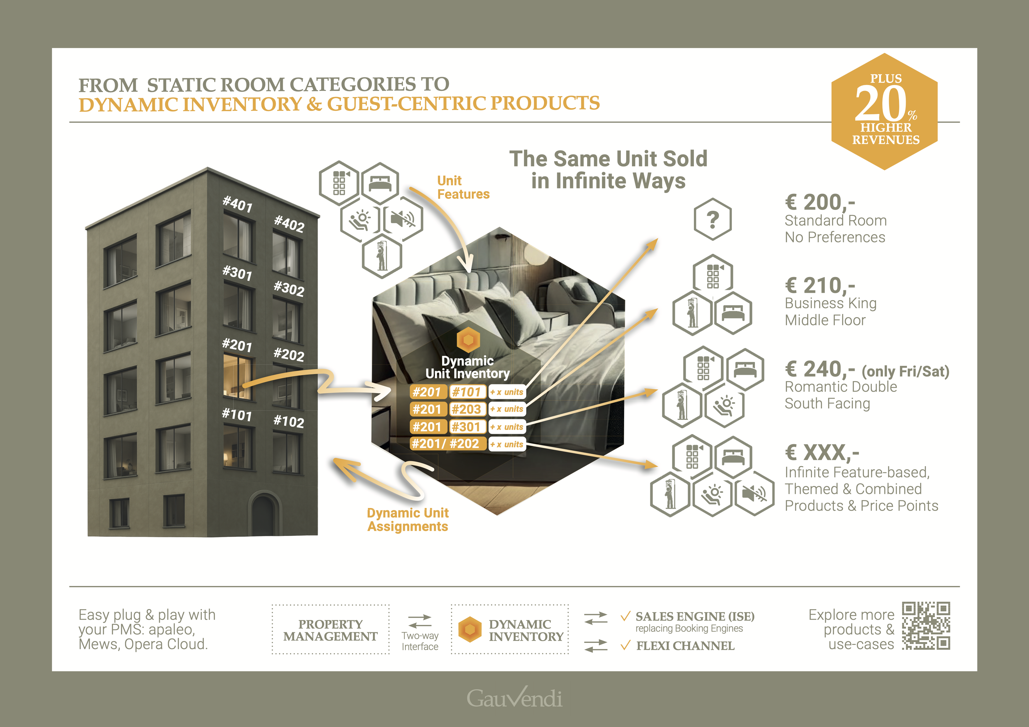 GauVendi’s platform empowers accommodation providers with a full suite of tools across four pillars: (1) Core Platform features include a performance dashboard, dynamic pricing and availability, feature and ancillary product management, digital assets, event data, reservation handling, PSP integration, multilingual emails, and user/system administration. (2) Demand Generation tools support Meta Search, Google Ads, and AI-powered search with PickYourMatch GBT. (3) Booking & Distribution offers a next-gen Booking Engine, Call Pro Plus (call center & proposal module), and Flexi Channel (channel manager). (4) Revenue & Automation Tools include Inventi Flow for inventory optimization, Sales Optimizer for restriction automation, and advanced Business Intelligence.